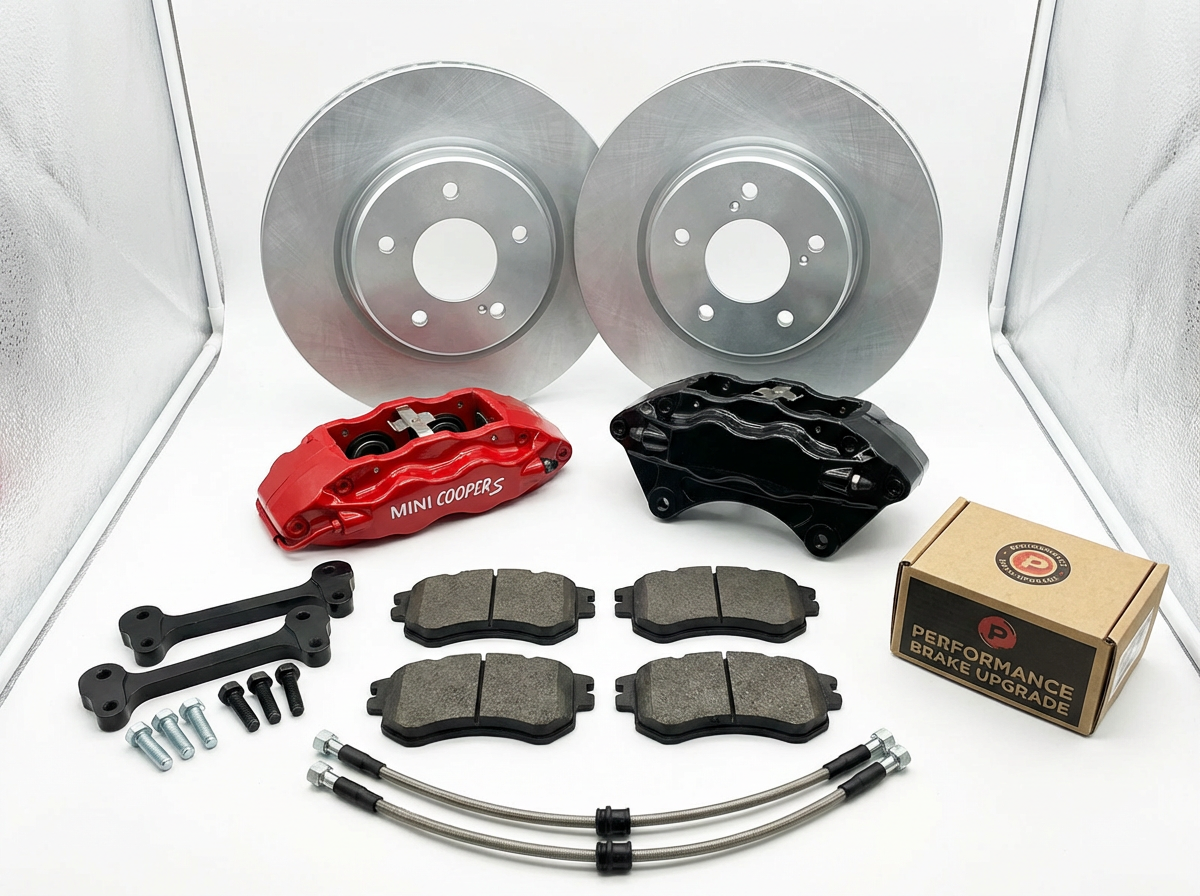 Front disc brake conversion kit for classic Mini Cooper S. Includes calipers, rotors, pads, and mounting hardware. Significantly improves stopping power over drum brakes.