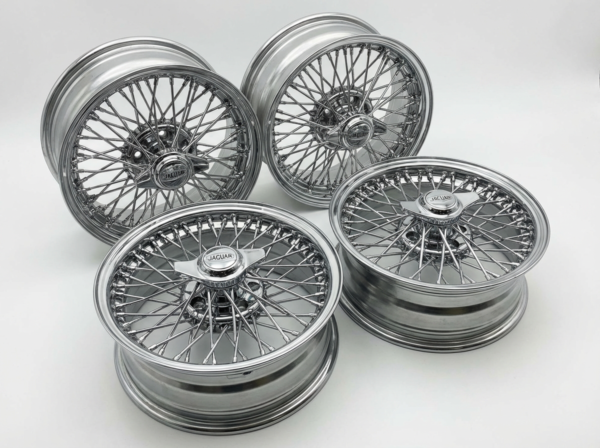 Set of 4 original Jaguar E-Type 72-spoke wire wheels with knock-off spinners. 15-inch diameter, chrome finish in excellent condition. Suits Series 1 and 2 E-Types.