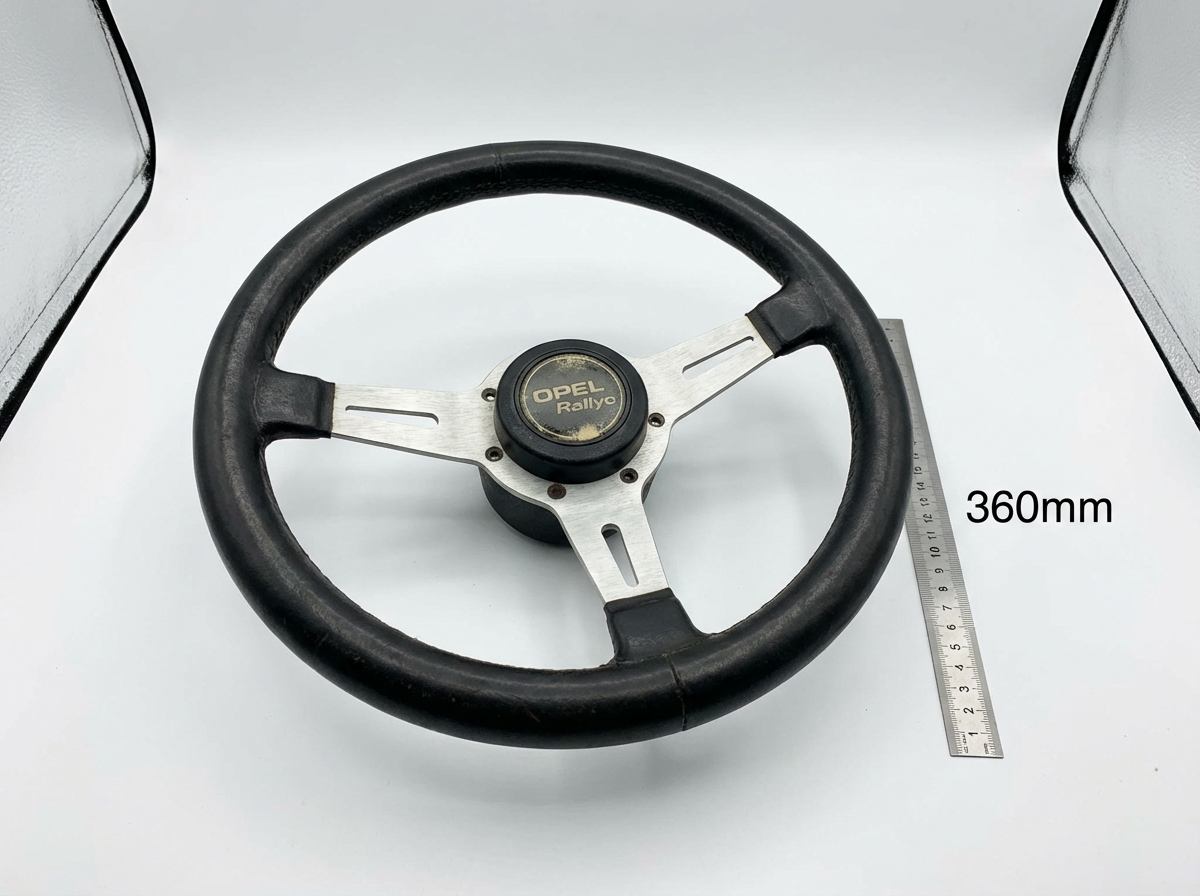 Rare rally-spec steering wheel for Opel Kadett C. Three-spoke design with leather wrap. Diameter 360mm, deep dish profile. Perfect for rally or period-correct restomod builds.